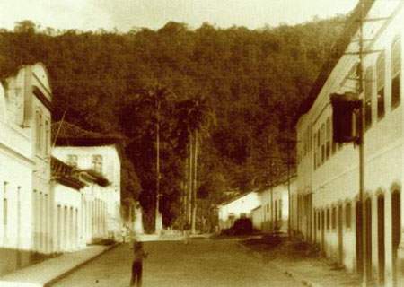 Rua do Cruzeiro, atual Av. Raul Pompéia, esquina com a Rua do Comércio. À direita, a fachada lateral do sobrado que abriga a atual Casa da Cultura. Aos fundos o cruzamento com a Rua da Conceição e a Rua das Palmeiras. (Podemos notar o Morro do Santo Antonio ainda sem casas). Data provável década de 40. |